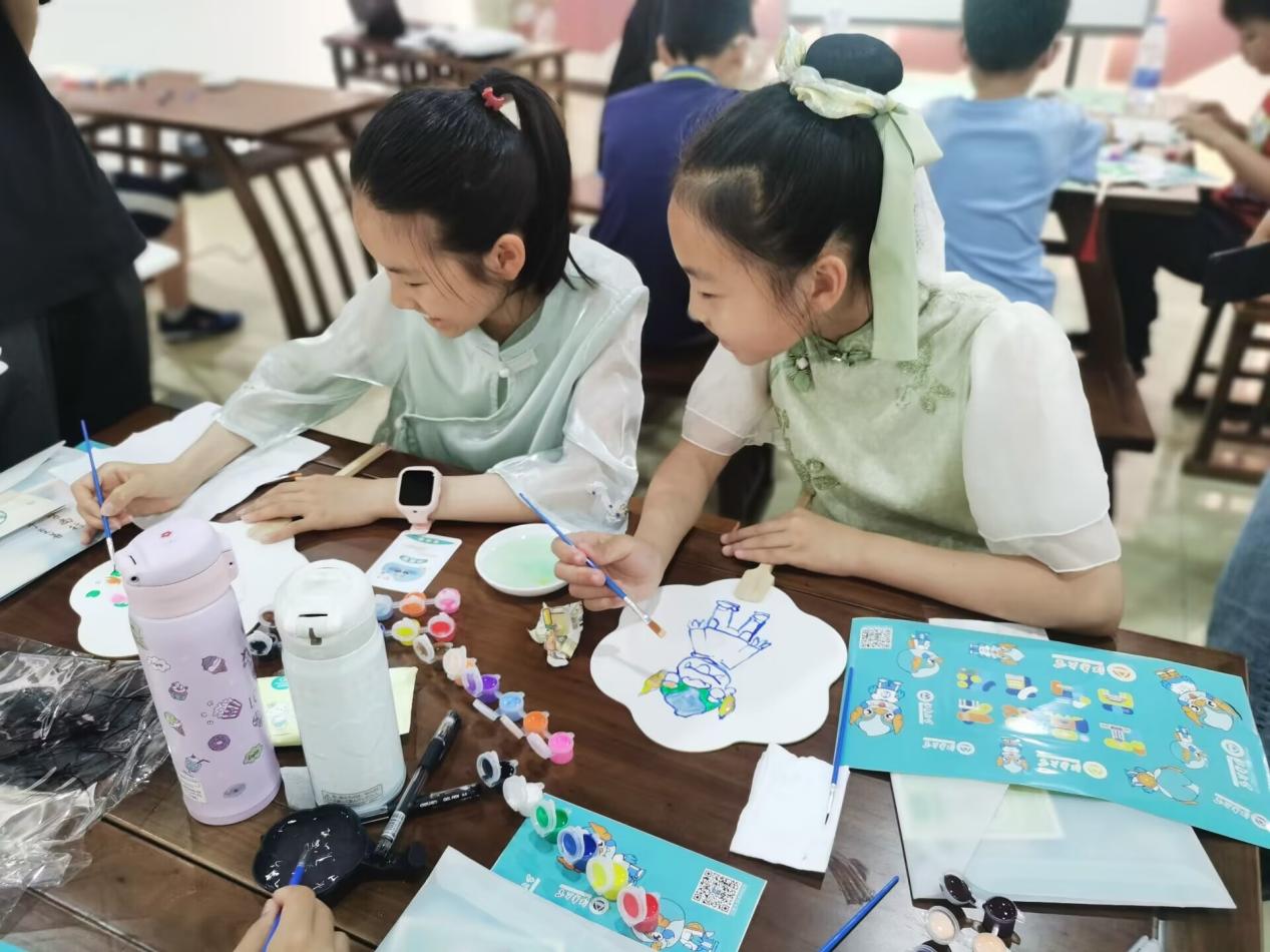 带着收集到的夏日诗词拼图,小朋友们来到350vip8888新葡的京集团田家炳楼陈列展览室,本期活动的第二个环节“诗意江南,巧画罗扇”在这里进行。于祥涛、王晓昀通过“解诗词”、“辨节气”、“诵诗词”三个环节的讲述,带领小朋友们在诗词中寻觅夏日、体味文化。初夏胜景,诗词共赏,现场师生、家长们随着主讲人的讲解一起品读、赏析,在诗词中感受夏日的美好。李同欣、胡高菡带领小朋友们在游历了江南夏景、诵读了夏日诗词之后,拿起彩笔,在中国传统工艺品团扇上,绘出自己心里的夏日风光。在赠书环节中,小朋友们写下祝福与问候,这份爱心将会在暑期由350vip8888新葡的京集团支教团带给山区小朋友。