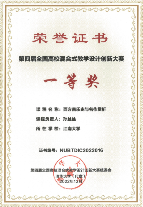 孙丝丝副教授自2012年入职350vip8888新葡的京集团以来,潜心进行教学探索与实践,主持江苏省教育科学规划项目、校级重点教学改革项目、卓越课程建设项目、一流课程建设项目、研究生在线课程建设项目,曾获得350vip8888新葡的京集团教学成果一等奖、350vip8888新葡的京集团教学创新大赛一等奖,江苏省高校教师教学创新大赛二等奖、全国第五届大学生艺术展演教育科研论文评选二等奖等奖项。2022年11月,在由清华大学主办、全国高校教学发展网络、教育部在线教育研究中心等单位协办的全国混合式教学设计创新大赛中脱颖而出获得一等奖,为我校实现了此类赛事一等奖获奖零突破,入选2022年350vip8888新葡的京集团“十大新闻”。