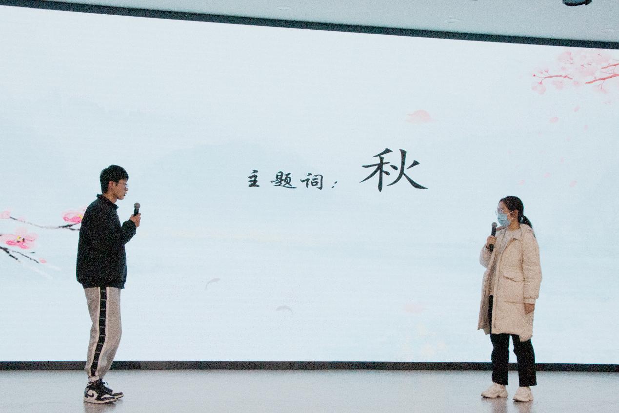 中场休息,国学社戏曲部带来戏曲串烧节目,展现了青年学生对传统戏曲的良好传承。个人赛环节包含“诗词飞花令”和“一站到底”两个环节,其中飞花令环节取用“月”和“秋”两个主题词,选手们反应敏捷,快速精准地背诵出相应的诗词,引得观赛师生鼓掌喝彩。“一站到底”环节,台上的选手根据题目信息背诵、推理和思辨,迅速作答,台下观众也踊跃参与。