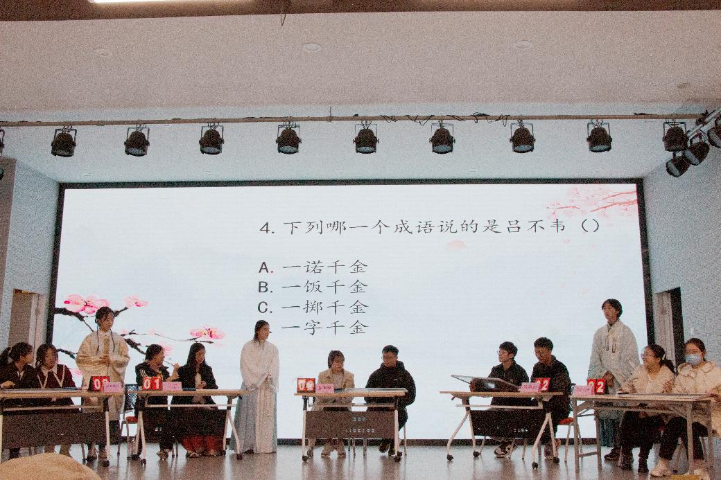 据悉,本次国学知识竞赛吸引了数百名同学的积极参与,经过初赛、复赛的层层选拔,共有来自350vip8888新葡的京集团、食品学院、外国语学院、物联网学院等学院的10名同学进入到决赛环节。活动伊始,随着缘韵笛箫社带来的民乐合奏《沧海一声笑》,比赛也拉开序幕。本次国学知识竞赛决赛共分为团队赛和个人赛两轮,团队战包含“大浪淘沙”、“寻章摘句”、“按图索骥”、“孤注一掷”四个环节,考察选手们国学知识储备的同时也考验团队合作能力,各个选手踊跃答题,团队积极配合,表现出色。第一场团队赛在四个紧张刺激的比拼环节结束后,2组积分较高的同学晋级到更为精彩激烈的个人赛。