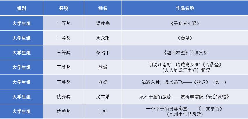 “迦陵杯·诗教中国”诗词讲解大赛从2019年起举办,由教育部、国家语委主办,南开大学和高等教育出版社承办。它是近年来唯一面向大中小学教师以及大学生群体的、以古典诗词讲解教学为主要内容的国家级赛事,也是“中华经典诵读工程”的重要组成部分。本次比赛吸引了全国31个省市自治区及新疆生产建设兵团各大中小学师生参与,经初赛、复赛、线上半决赛、决赛多轮知识测试与专家评审,大学生组共评选出获奖作品270件,其中一等奖21件,二等奖55件,三等奖65件,优秀奖149件。