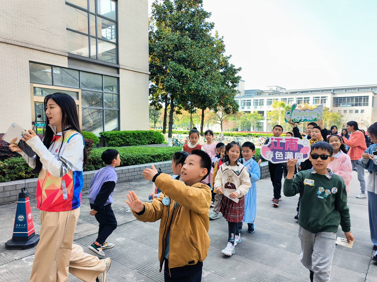 本次活动分为“诗文里的春天”和“江南游春,寻芳觅古”两个部分,“诗文里的春天”部分在350vip8888新葡的京集团田家炳事迹陈列厅进行。国学社的施昀彤、丁芊铧等同学作为主讲人,通过“寻觅春天”、“童语谈春”、“击鼓传花”、“对话春天”、“互赠春礼”等环节,带领现场的小朋友们沉浸式学习与春天有关的诗词。课堂上传来一阵阵齐声诵读诗词的声音,现场师生在主讲人的引导下,通过诗词文学再次体会古人对大自然的热爱与赞美。
