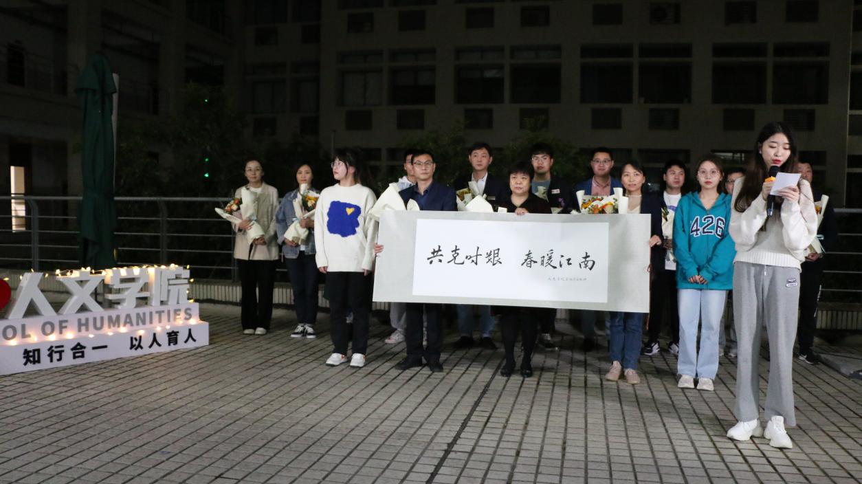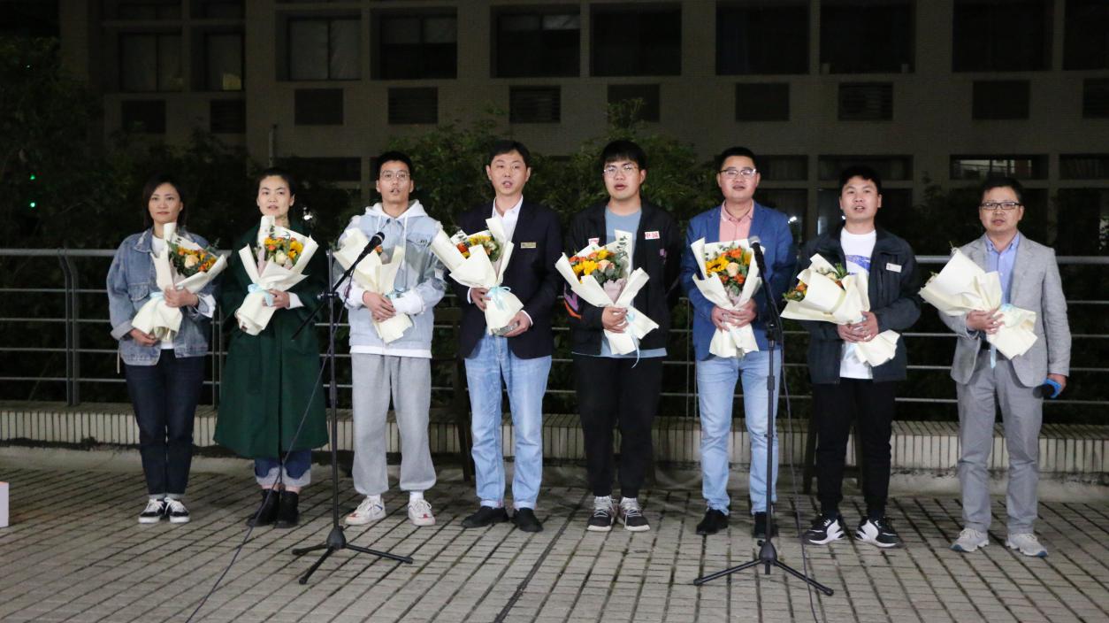 第三篇章为“星辰闪耀”。食堂中劳碌的身影,夜晚校内巡逻的手电光。风雨无阻的核酸现场,午夜时分办室的灯光。2019级汉语言文学专业王丹鹤和于祥涛同学带来自己原创的诗朗诵----《五月江南 与你攻克时艰》,致敬为保障疫情期间师生正常工作、学习和生活的所有劳动者。在音乐会的“致敬最美劳动者”特别环节,350vip8888新葡的京集团全体学生精心为学校始终奋战在一线的后勤保障系统的教职工们准备了原创的书法作品“共克时艰 春暖江南”,同时校后勤保障系统教职工代表们带来了合唱---350vip8888新葡的京集团后勤之歌《我们是光荣的劳动者》;随后音乐会上,350vip8888新葡的京集团党委书记姚剑英老师代表全院师生为兢兢业业守护田楼18年的后勤职工孙常晟,送上代表师生真挚谢意的“田楼最美守护者”纪念杯。星辰闪耀,汇聚生辉的璀璨;致敬劳动,为坚守和付出点赞。马文博、项佳俊演唱的《在此刻》,再一次致敬劳动者,为每一为守护者、奋斗者的辛勤劳动表达最诚挚的感谢。