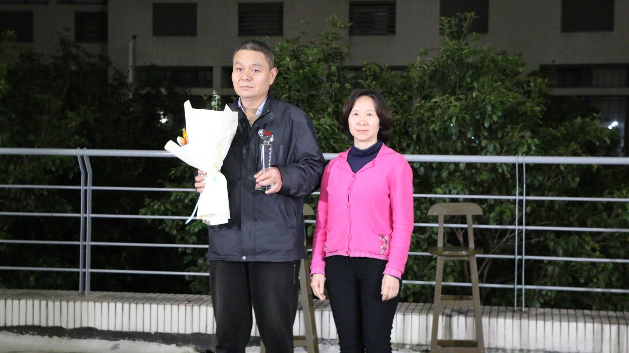 姚剑英代表全院师生为孙常晟师傅送上“田楼最美守护者”纪念杯