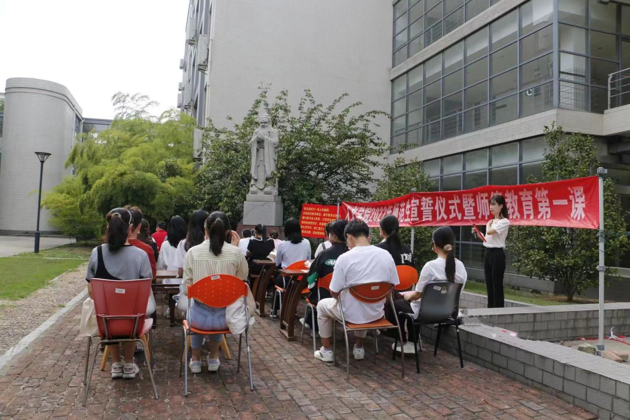 为庆祝第三十八个教师节,进一步加强师德师风建设,增强师范生对教师职业的责任感与使命感。9月9日下午,350vip8888新葡的京集团在第一教学楼北广场孔子像前隆重举行2022年师范生宣誓仪式暨师德教育第一课。350vip8888新葡的京集团党委副书记、副院长李萍,350vip8888新葡的京集团副院长于书娟,350vip8888新葡的京集团田良臣教授和师范生新生代表共同参加了本次活动。由于疫情影响,活动采用“线上+线下”直播形式,联动全院全体师范生共同庆祝教师节这一光荣而神圣的节日。活动开始之前,师生一起观看了《习近平的教师情》专题篇。