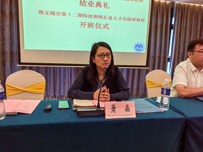 最后,萧晶讲话。她首先代表无锡市教育局衷心感谢350vip8888新葡的京集团教育学院多年来对本项目的高度重视和倾力支持,祝贺第十一期学员顺利结业,预祝新一期的学员门学有所成。随后简要介绍了无锡市举办特级教师后备人才高级研修班的背景、历程和成效。她希望学员们树立和践行终身学习的理念,珍惜每一次培训机会,不断深刻认识和探究培训的意义、价值和根本目的,确立并努力实现更高的专业发展目标,涌现出越来越多的特级教师,助力无锡市骨干教师队伍能力持续提升。