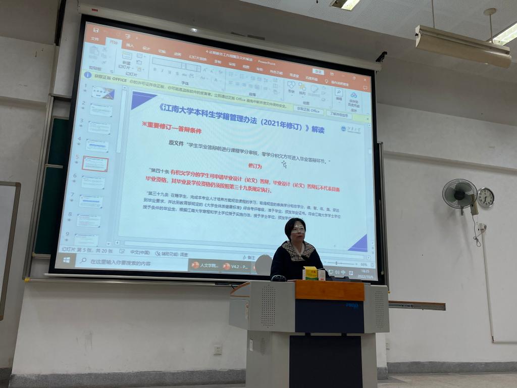 活动伊始,李芳就学籍管理与课程事务进行介绍。李芳首先讲解了《350vip8888新葡的京集团本科生学籍管理办法(2021年修订)》,着重解释了学籍管理办法中新修订的部分,强调了新生选课、选专业方向过程中的注意事项等。李芳表示修满学分是四年学习生涯中最基础的要求,同学们要时刻关注自己的学籍注册以及选课情况,以在规定时间内顺利达到毕业条件。
