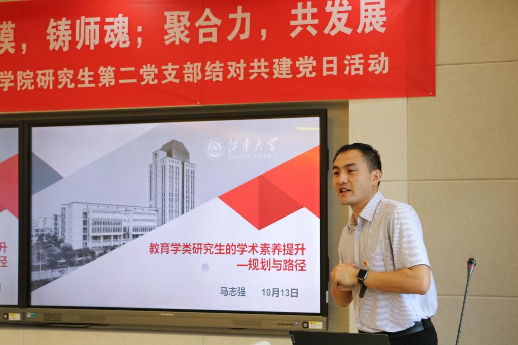 在“共话科研成长”环节,围绕同学们关心的论文写作、毕业设计开题等学术问题,马志强做《教育学类研究生的学术素养提升—规划与路径》专题报告,他从“学术输入”“学术输出”两部分,详细讲解了教育学类研究生学术素养提升的方法。在“共话学习提升”环节,在350vip8888新葡的京集团研究生党员程苗苗的领学下,与会人员共同学习了习近平总书记给全国高校黄大年式教师团队代表回信精神及《师德优秀典型先进事迹》。在“共话防疫抗疫”环节中,学生代表黄馨分享了假期抗疫志愿服务实践经历,社科处原副处长曾向红详细讲解了学校防疫工作要点,双方党支部书记代表支部互赠防疫物品与礼物。在“共话共建共赢”环节,350vip8888新葡的京集团研究生第二党支部书记杨玥、机关党委社会科学处党支部书记杨恋恋分别总结了本支部上半年工作,并畅谈了合作共建计划。最后,在“共话学科发展”环节,师生党员共同参观“互联网+教育”研究基地和人工智能教学实验室,立足教育学科前沿,共同展望学科未来发展。