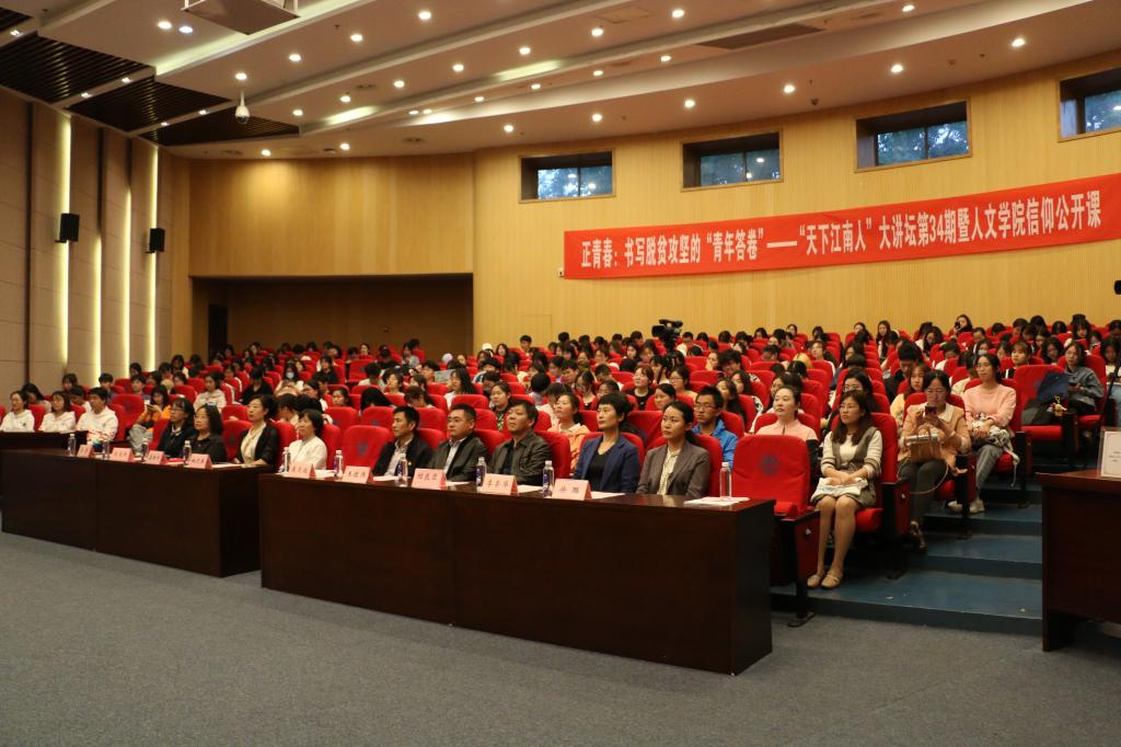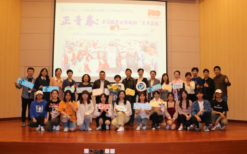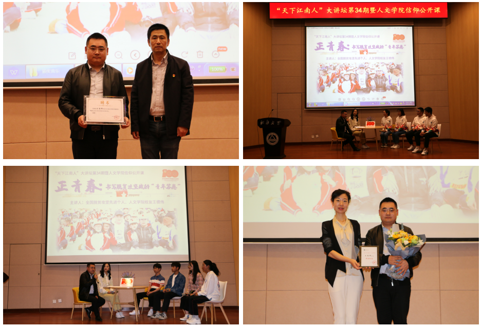 为传承五四精神,引导江大学子树立教育报国理想,4月29日,“正青春:书写脱贫攻坚的‘青年答卷’”——“天下江南人大讲坛”第34期暨350vip8888新葡的京集团信仰公开课活动在远东报告厅隆重举行。本次活动由350vip8888新葡的京集团社会资源处、350vip8888新葡的京集团学生工作部(处)、共青团350vip8888新葡的京集团委员会主办,350vip8888新葡的京集团承办。受党中央、国务院表彰的“全国脱贫攻坚先进个人”、350vip8888新葡的京集团小学教育专业2015届校友王德伟结合教育援藏经历进行了精彩分享。350vip8888新葡的京集团党委副书记戴月波、350vip8888新葡的京集团党委书记姚剑英、副院长(主持工作)田良臣、社会资源处副处长窦新华、学生工作部副部长李荣华、350vip8888新葡的京集团党委副书记兼副院长李萍、小教1101班班主任肖凌燕、350vip8888新葡的京集团原2011级辅导员徐璐等老师与300余名学生代表共同参加了活动。