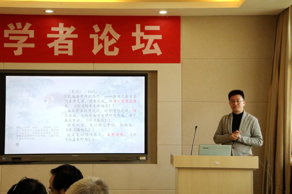 周游副教授以“无锡国专与桐城派古文”为题,通过分析桐城派后期古文发展史上三场重要对话,揭示桐城派文学观念对唐文治先生的影响。随后介绍了韩愈以诗为文说,指出现在很多学者都认为此观点创自钱穆,其实早在上世纪三十年代,无锡国专的陈柱就已经提出了该观点。陈柱这一观点的形成,源自他对曾国藩的韩文评点的体悟,也是因为无锡国专一直受到曾国藩以来的桐城派古文传统的影响,这体现了桐城派古文与无锡国专的深刻关系。