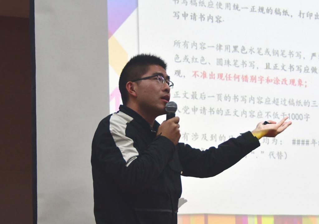 最后,赵将老师为学员阐述“青年大学生递交入党申请书的注意事项”,其中包括入党条件、入党申请书格式、以及其他书写注意事项等,使得学员对于入党相关事宜了解更细致全面、对于入党申请这一重要事务能够做到心中有数。