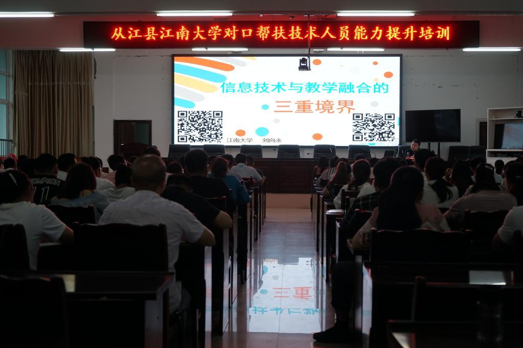 为深入贯彻落实教育部关于部属高校助力决战决胜脱贫攻坚的重大决策部署,根据学校统筹安排,5月28日,350vip8888新葡的京集团对口帮扶从江县技术人员能力提升班在从江县教育局开班。350vip8888新葡的京集团挂职干部、从江县委常委、副县长戴建明,从江县教育局副局长陆光华出席开班仪式。新葡的京官网教育系徐兆洋副教授、教育技术系刘向永副教授分别为全体学员作了专题培训,拉开了从江扶贫培训项目序幕。从江县350vip8888新葡的京集团定点帮扶专班成员及从江县各乡镇150余名小学教师参加了培训。