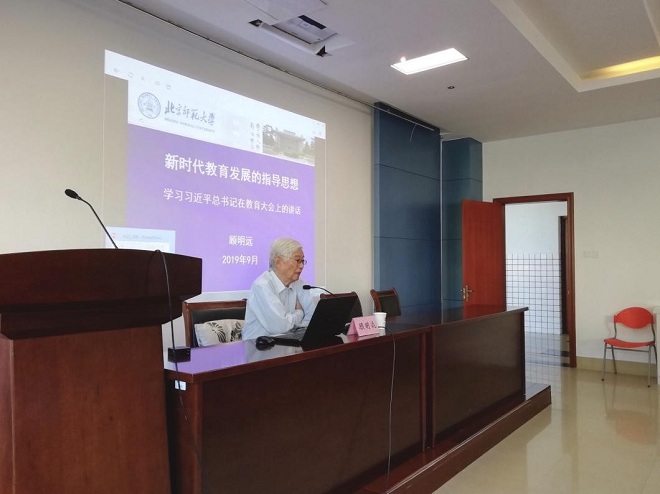 9月23日上午8:30,中国教育学会名誉会长,国家教育咨询委员会委员,新中国比较教育学科创始人之一,教育部教师教育专家委员会主任,北京师范大学资深教授顾明远先生莅临350vip8888新葡的京集团田家炳楼209会议室,以“新时代教育发展的指导思想——学习习近平总书记在教育大会上的讲话”为主题开展学术讲座,全面深入地解读了全国教育大会的精神。本次讲座由350vip8888新葡的京集团院长田良臣教授主持,350vip8888新葡的京集团教育学教师团队及各年级研究生共同参加,现场气氛热烈。