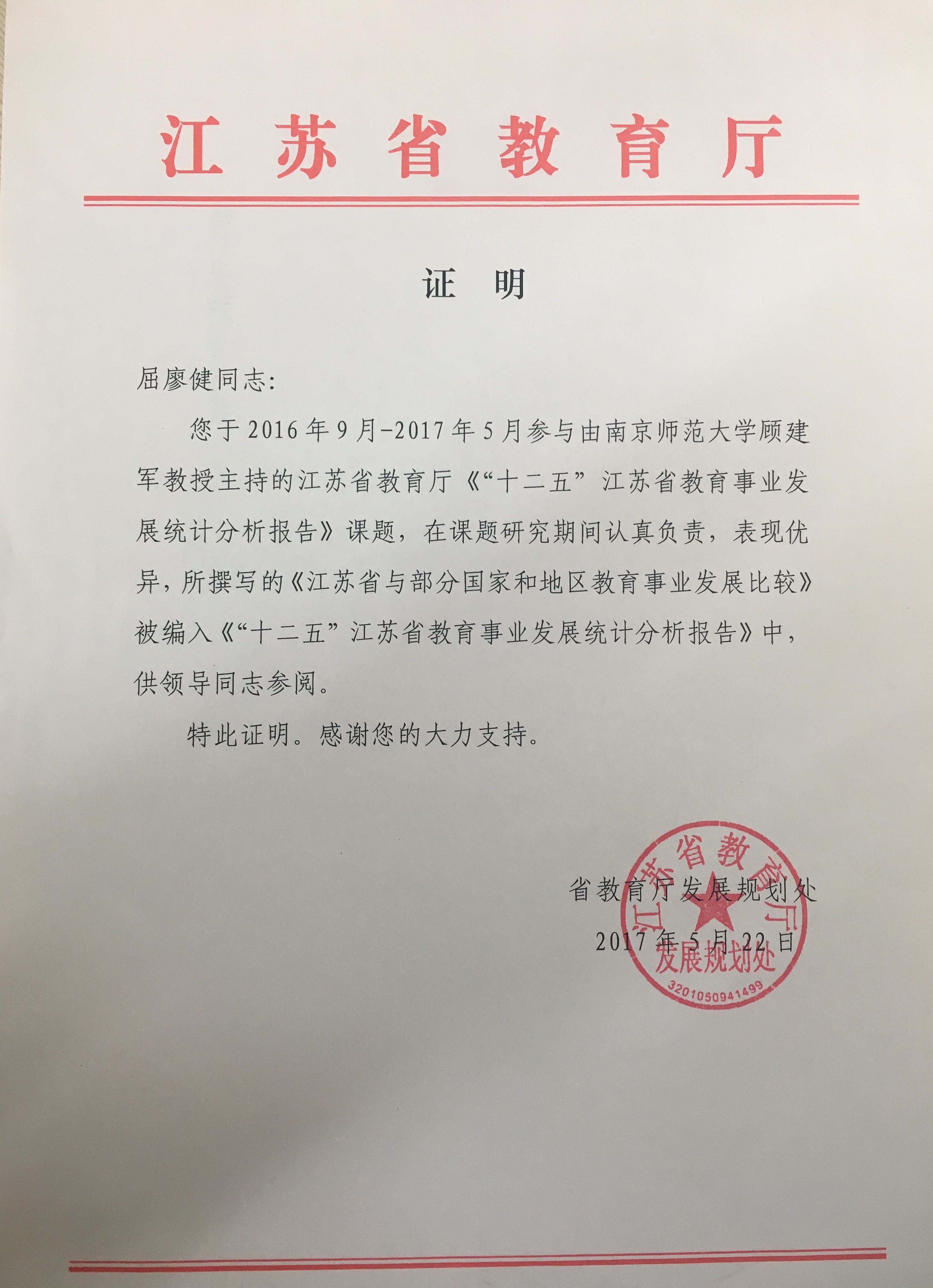 “十二五”江苏教育事业发展统计分析报告近日由南京师范大学出版社出版发行,350vip8888新葡的京集团屈廖健博士所撰写的教育政策分析报告“江苏与部分国家和地区教育事业发展比较”被收入其中。