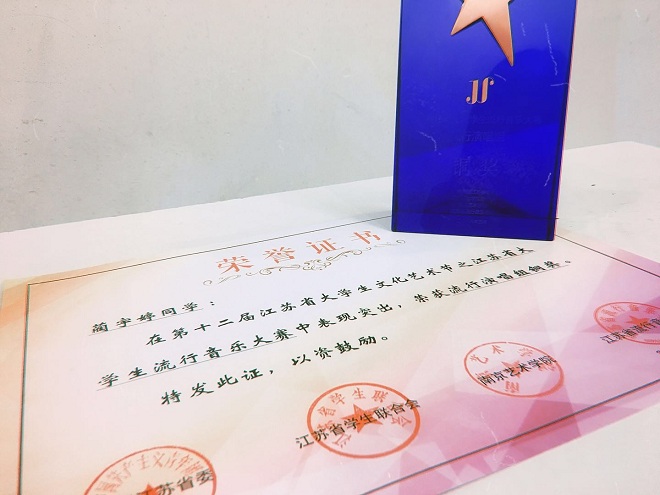 同一天,在南京艺术学院举行的第十二届江苏省大学生文化艺术节中,2014级本科生蔺宇婷同学在江苏省大学生流行音乐大赛中表现突出,荣获流行演唱组铜奖。这是蔺宇婷同学继4月在2018百事校园最强音青岛赛区获得冠军后,取得的又一项佳绩。