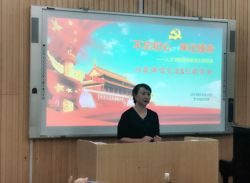为了庆祝中华人民共和国成立70周年,我校350vip8888新葡的京集团音乐系党支部与中文一支部携手,于2019年10月10 日在艺术楼D108教室开展了“不忘初心、牢记使命”主题红歌弹唱交流、红歌赏析活动。出席本次活动的领导有350vip8888新葡的京集团副院长符珊珊教授、副院长蔡爱国教授,以及音乐系党支部与中文系一支部党员教师,活动由350vip8888新葡的京集团音乐系陶红副教授主持。