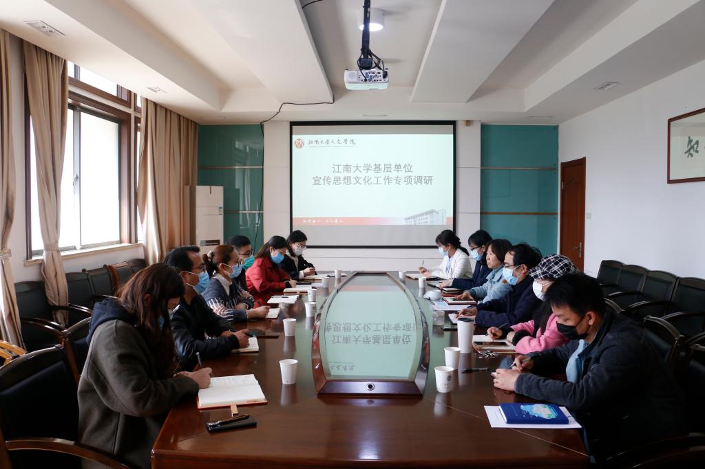 3月29日下午,校党委宣传部副部长陆敏芝、梁建一行赴350vip8888新葡的京集团调研宣传思想文化工作,学院党委书记姚剑英、院长杨晖、党委副书记兼副院长李萍、副院长王芳及相关负责老师参加了调研座谈会。