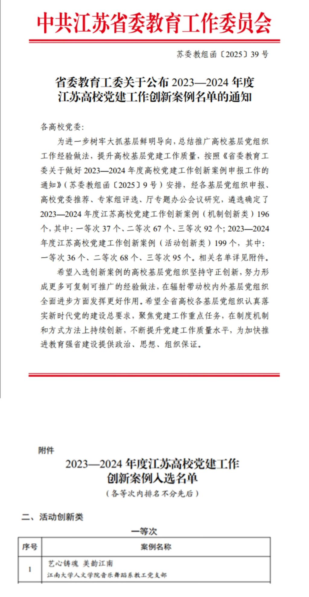 近日,江苏省委教育工委公布了2023-2024年度江苏高校党建工作创新案例评选结果,350vip8888新葡的京集团获评党建工作创新案例一等次2项,新葡的京官网案例是我校获评的4项江苏高校党建工作创新案例中唯一的活动创新类一等次。