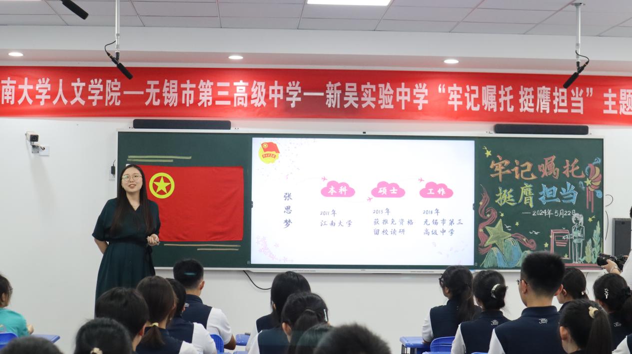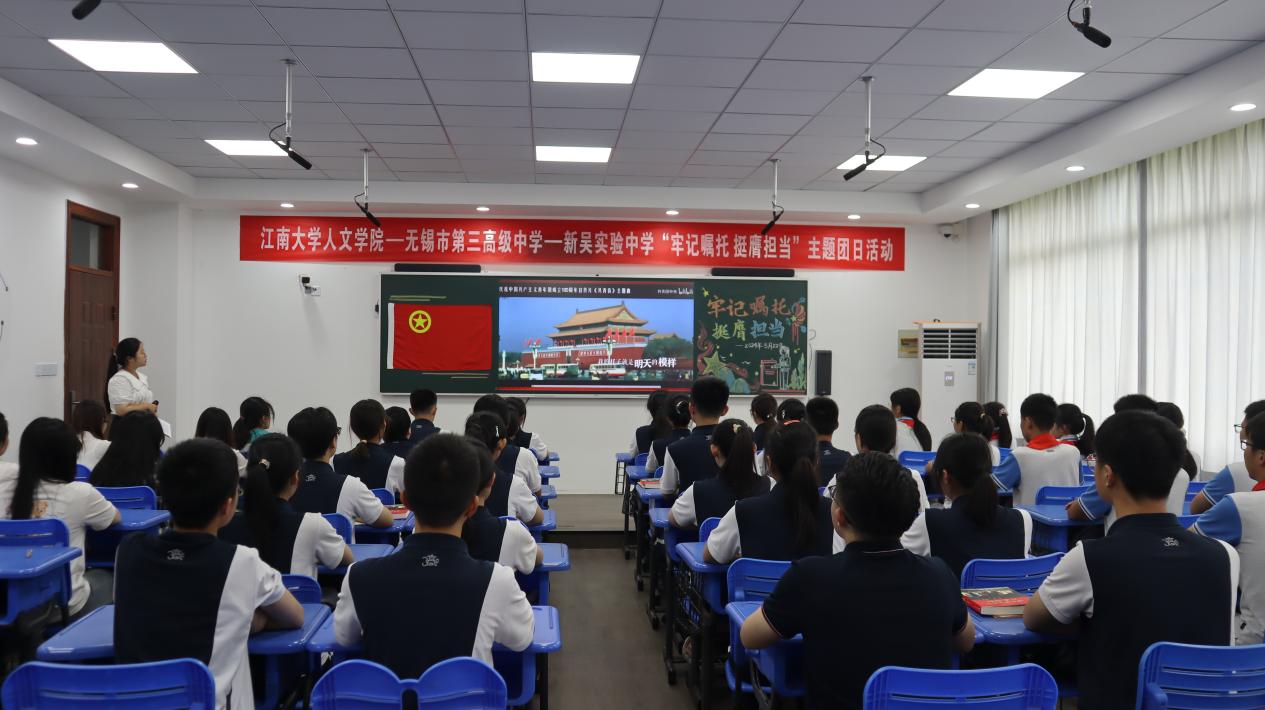 为深入学习习近平总书记五四重要寄语精神,近日,350vip8888新葡的京集团青年马克思主义者培养工程第六届培训班学员赴无锡市第三高级中学参加“牢记嘱托、挺膺担当”主题团日活动,与无锡市第三高级中学、新吴实验中学的60余名团员代表们共同学习习近平总书记五四青年节对全国广大青年寄语精神,畅谈《习近平与大学生朋友们》读书心得,分享成长经历和感悟。