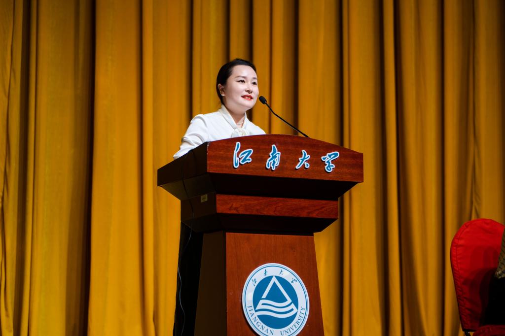 佩戴校徽仪式上,学院领导为新生代表佩戴校徽,希望全体新生能秉持着“笃学尚行,止于至善”的校训精神和“学高为师,身正为范”的人文情怀,奋力谱写“江南人”的崭新荣光。