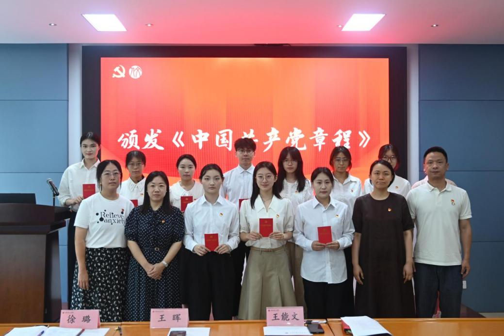 王晖、徐璐、王能文为新发展党员代表颁发《中国共产党章程》。全体党员在王能文的带领下面向党旗庄严宣誓。