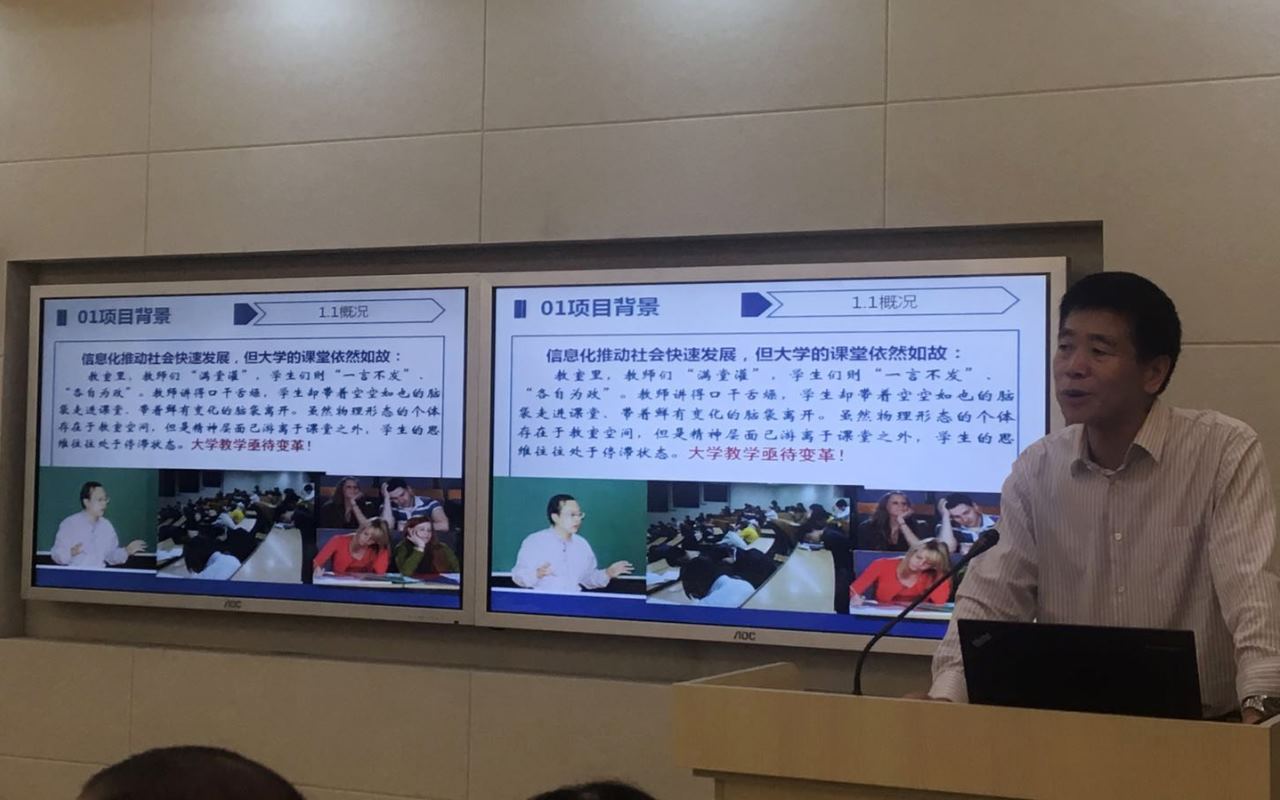 课题负责人陈明选教授首先从项目背景、项目研究问题与目标、项目成果和实践案例等方面对课题的实施情况进行汇报,项目经过两年实施,取得了四方面研究成果与应用成效:(1)构建了着重理解的混合式教学改革理论体系,探索了“翻转课堂”、“着重理解的多元评价”等教学设计方法,发表了系列教学改革论文;(2)结合教改试点专业-350vip8888新葡的京集团教育技术学教学现状,重点在《电视编导与制作》、《多媒体课件设计》、《教育技术导论》、《学与教的心理学》等四门课程进行了实践探索,形成了具有推广价值的混合式教学实践案例;(3)将理论与实践方法充分的运用于课程建设中的《现代教育技术应用》课程,该课程最后获得国家资源共享课程;(4)项目试点专业学生表现出了思维活跃,创新意识成果强,理论扎实,实践技能过硬的特征,在全国和省市各类大赛中获60余项奖励。之后陈教授以《电视编导与制作》课程为例,详细介绍着重理解的翻转课堂设计与实施,在评价方面,该课以学生理解力水平为评价标准,以维金斯理解水平的六纬度、比格斯的SOLO评价为工具,对学生的作品进行评价,创新评价机制。最后,陈教授播放了学生期末作品《电视编导不得不学的N大理由》,该作品是学生以自己的学习过程和亲历感受以电视作品表达了自己喜欢电视编导课程的理由。作品生动形象的展示了学生通过基于理解的混合式学习后所获得的知识与技能,作品所表现出的专业水准和感染力得到与会专家们的一致好评。