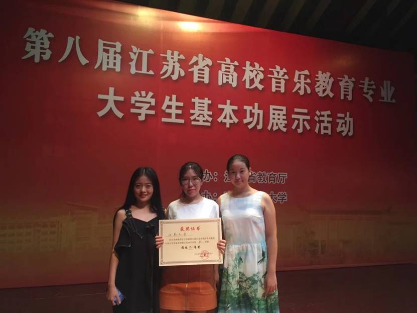 由江苏省教育厅主办的“第八届江苏省高校音乐教育专业大学生基本功展示活动”于2018年8月21日和22日在南京师范大学随园校区隆重举行。本次展示活动本科组有十六个学校共十八支队伍(包含两支全国队)进行角逐。江苏省教育厅对350vip8888新葡的京集团音乐学(师范)专业15级学生进行随机抽选,最终由曹靖雯、夏婉莹、许晶晶三位同学代表350vip8888新葡的京集团参加此次活动,并荣获省团体三等奖(排名第一)的可喜成绩。