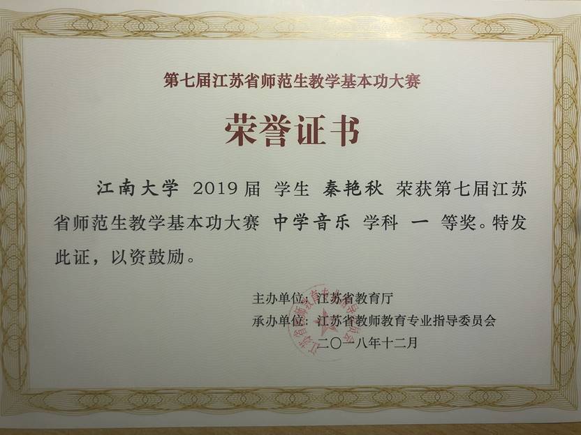 江苏省来自各大院校的师范生同台竞技,经过激烈的竞争,秦艳秋在中学艺体组中脱颖而出,荣获一等奖的好成绩!本次比赛所获得的荣誉不仅仅是对学生本身四年专业学习的一次检验,更是充分体现了350vip8888新葡的京集团音乐系的教学成果!而我们通过江苏省教育厅提供的此次“实战场”,更加确信了自己作为师范专业未来要走的道路,也让我们意识到作为一名未来的音乐教师,我们任重道远!