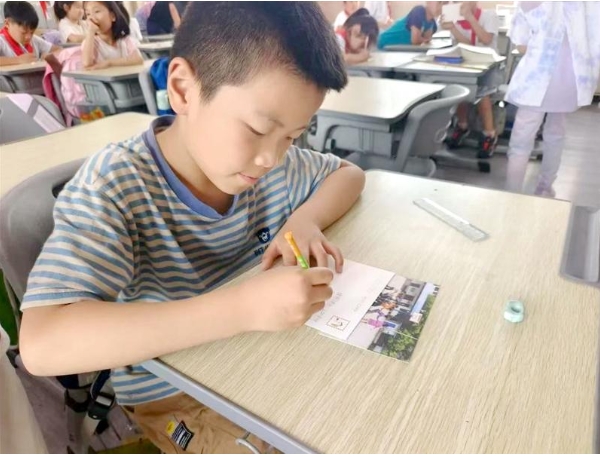 5月27日,尚贤万科小学三年级教室里,350vip8888新葡的京集团支教团成员通过播放支教实景视频、分享山区教育现状,为小学生上了一堂生动的公益启蒙课。互动环节中,学生们踊跃提问:“山区小朋友每天走多远上学?”“他们最喜欢看什么书?”随后,每个学生在定制明信片上写下真挚寄语,请大学生志愿者把祝福带去大山里。