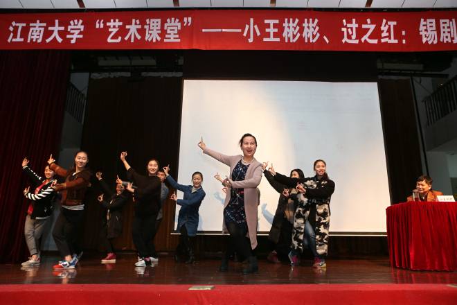 在观众热烈的掌声中,本次“艺术课堂”正式开始。过之红老师首先向观众普及了锡剧的相关知识,除了对传统唱腔进行讲解,她还现场演示了锡剧表演中动作、手势的摆放,并为观众献上了一场大气秀美的锡剧表演。随后,小王彬彬老师登台针对锡剧剧目中人物形象塑造进行了详细的讲解,在人物刻画方面提出了自己的见解,并进行了声情并茂的锡剧演唱,赢得了现场师生满堂喝彩。此外,两位老师还和现场观众进行互动,针对同学们在锡剧表演方面的疑惑进行了细心的解答。