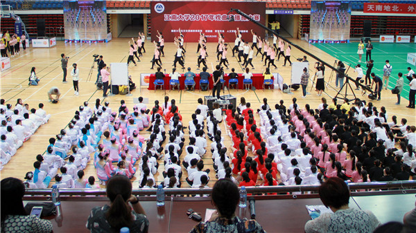 正式比赛前,本次比赛的裁判长、350vip8888新葡的京集团副院长符姗姗老师宣读比赛规则。比赛正式开始后,一支支整齐有序的参赛队伍身着各色服饰陆续登场,展现出的不再是大众印象中戏曲的“唱、念、坐、打”,也不仅是体操动作的“横平竖直”,而是在体操运动的基础上,把戏曲身段动作中的“腕花小云手”、“飞天十三响”、“拉山膀”、“亮相”、“涮腰”等融入整套动作,两者结合相得益彰,浑然天成。一招一式,收放自如,时而流畅有力,时而婉约柔美,配合着恰到好处的节律,用肢体动作这种无声的语言,使得情动于中而发于外。相近的舞蹈内容,在不同学院的精心演绎下展现别样的精彩风貌,通过动作改编和队伍排列展现别具的匠心。“自由运动”里,大家发挥想象力,自由展示,动作效果虽不能与行家相媲美,却也将迂回婉转的东方美和自成一派的潇洒体现得淋漓尽致,充分展现了江大学子蓬勃的青春与朝气。