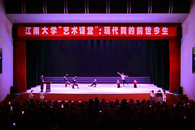 课堂伊始,灯光骤暗,八名轻快灵活的舞者在悠扬的伴奏中翩翩起舞,生动地还原了侯侠创作的现代舞《山水画》里的经典片段。舞毕,候侠介绍现代舞是一种解放身体和思想的舞蹈形式,具有“象征性、表现性、抽象性”的特点,在欣赏时,要“打开器官,引发思考”。特邀嘉宾赵伟愿在随后的舞蹈《随心》中,用自然灵动的舞姿完美地诠释了这点。