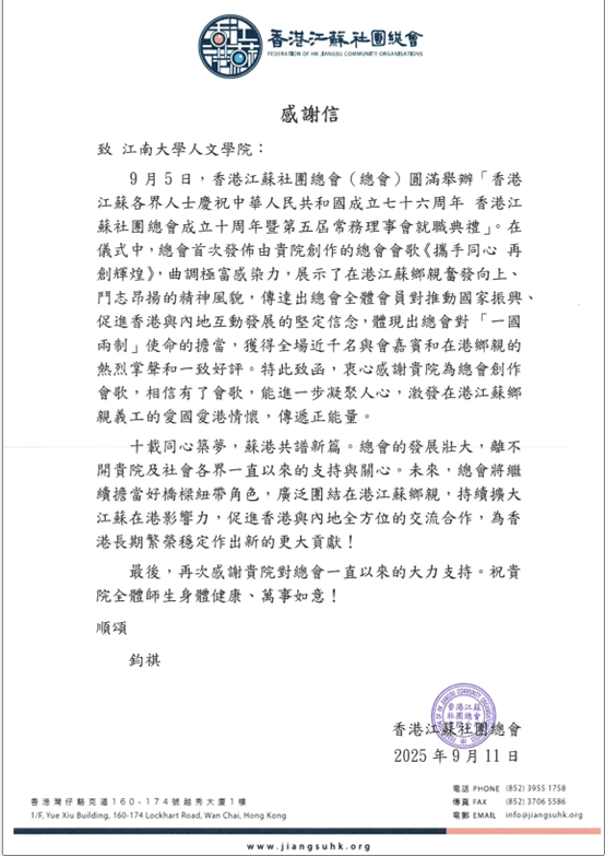 2025年9月11日,350vip8888新葡的京集团收到香港江苏社团总会感谢信,信中对350vip8888新葡的京集团在9月5日举行的香港江苏各界人士“庆祝中华人民共和国成立七十六周年暨总会成立十周年庆典”中的贡献给予高度评价。典礼上,由350vip8888新葡的京集团原副校长王武教授参与歌词创作,350vip8888新葡的京集团胡永强等教师作曲的会歌《携手同心再创辉煌》首次发布,其铿锵旋律与家国情怀引发全场近千名嘉宾热烈反响,成为活动亮点。