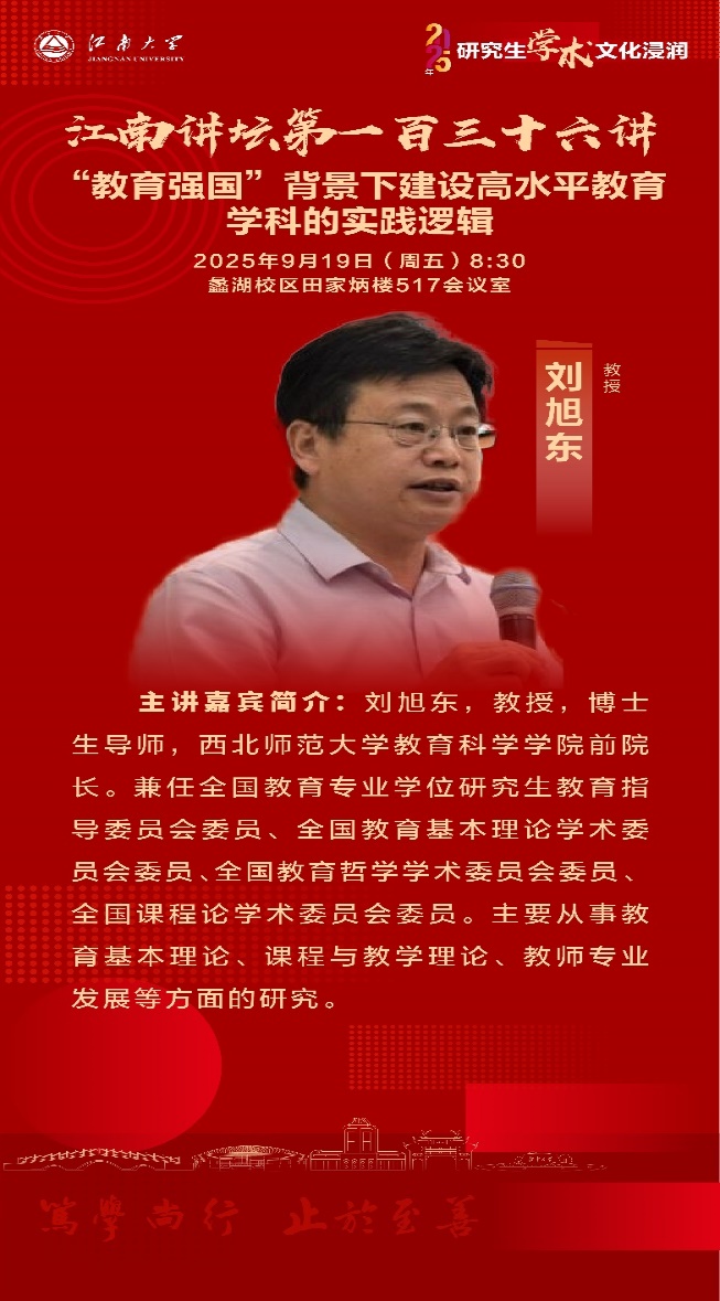 刘旭东,教授,博士生导师,西北师范大学教育科学学院前院长。兼任全国教育专业学位研究生教育指导委员会委员、全国教育基本理论学术委员会委员、全国教育哲学学术委员会委员、全国课程论学术委员会委员。主要从事教育基本理论、课程与教学理论、教师专业发展等方面的研究。