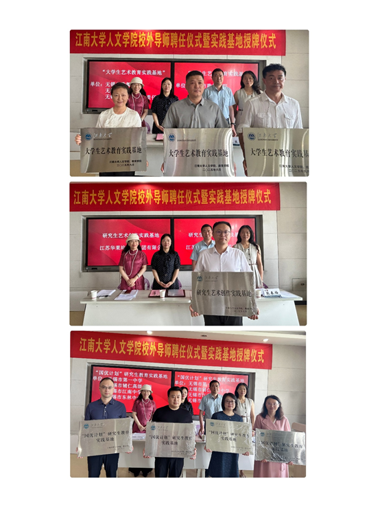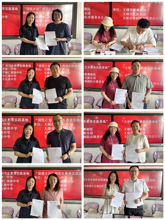 随后,在实践基地授牌仪式上,无锡市第一中学、无锡市辅仁高级中学、无锡市江南中学、无锡市东林中学被授予“国家优秀教师培养计划研究生教育实践基地”。无锡市歌舞剧院、无锡市民族乐团、无锡市锡剧院有限责任公司被授予“大学生艺术教育实践基地”。江苏华莱坞文化集团有限公司被授予“研究生艺术创作实践基地”。姚文生、王晖、张春梅、王芳长分别代表学校与上述8家合作单位签署了研究生实践基地协议,并为其授牌。