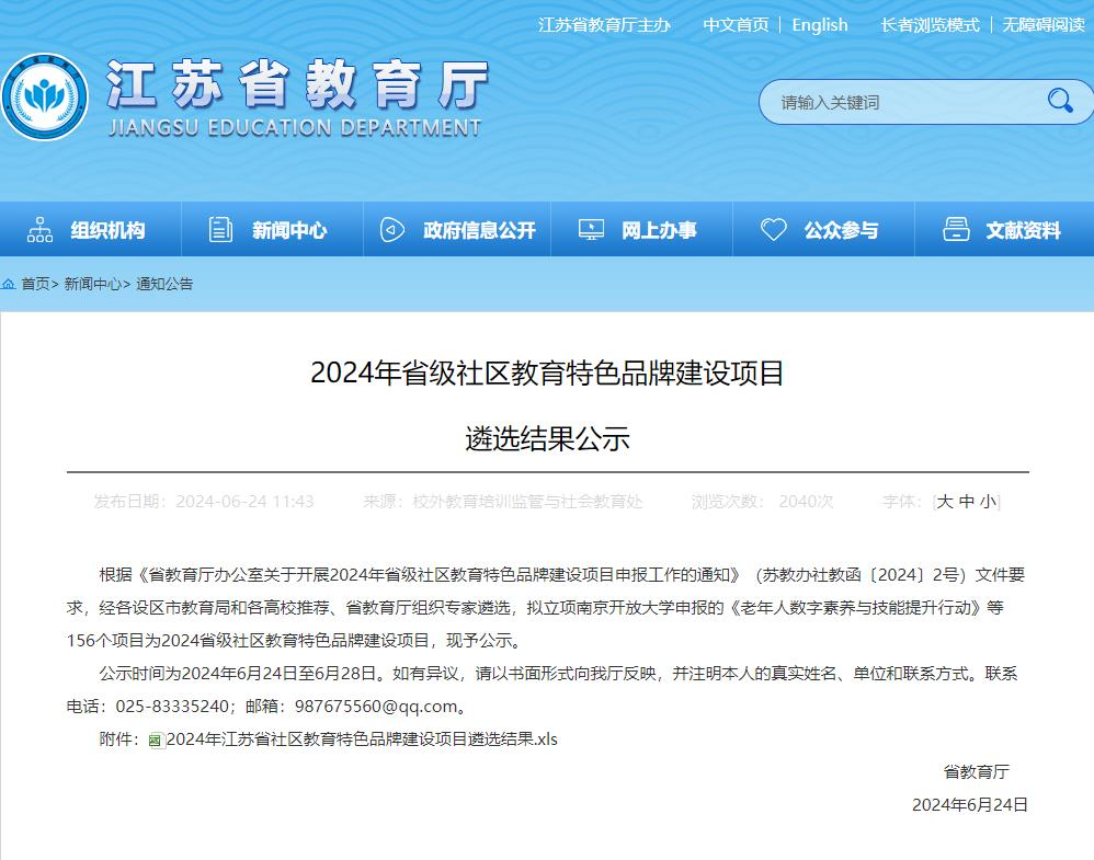 近日,江苏省教育厅公示2024省级社区教育特色品牌建设项目遴选结果。350vip8888新葡的京集团申报的“350vip8888新葡的京集团‘博习’社区教育服务项目”成功入选。