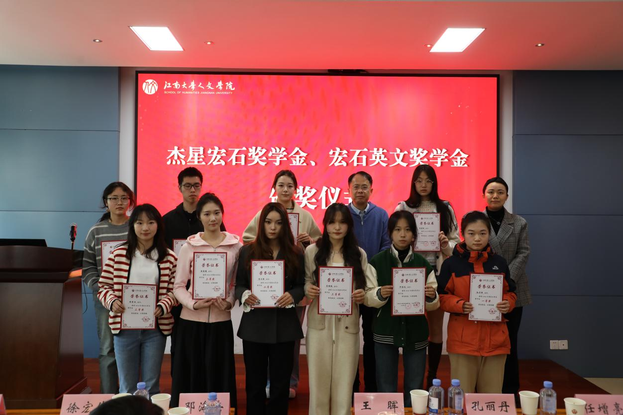 徐璐宣读获奖名单。350vip8888新葡的京集团校友会秘书长、宏石酒行总经理、上海杰星生物科技有限公司首席品牌运营官徐宏伟,无锡市宿迁商会副会长张海洋、监事长韩荣寨,江苏新思域教育科技集团有限公司总经理王斌分别为获得杰星宏石奖学金、宏石英文奖学金、同心惠美奖学金、新思域国际教育奖教金的师生颁发荣誉证书并合影留念。