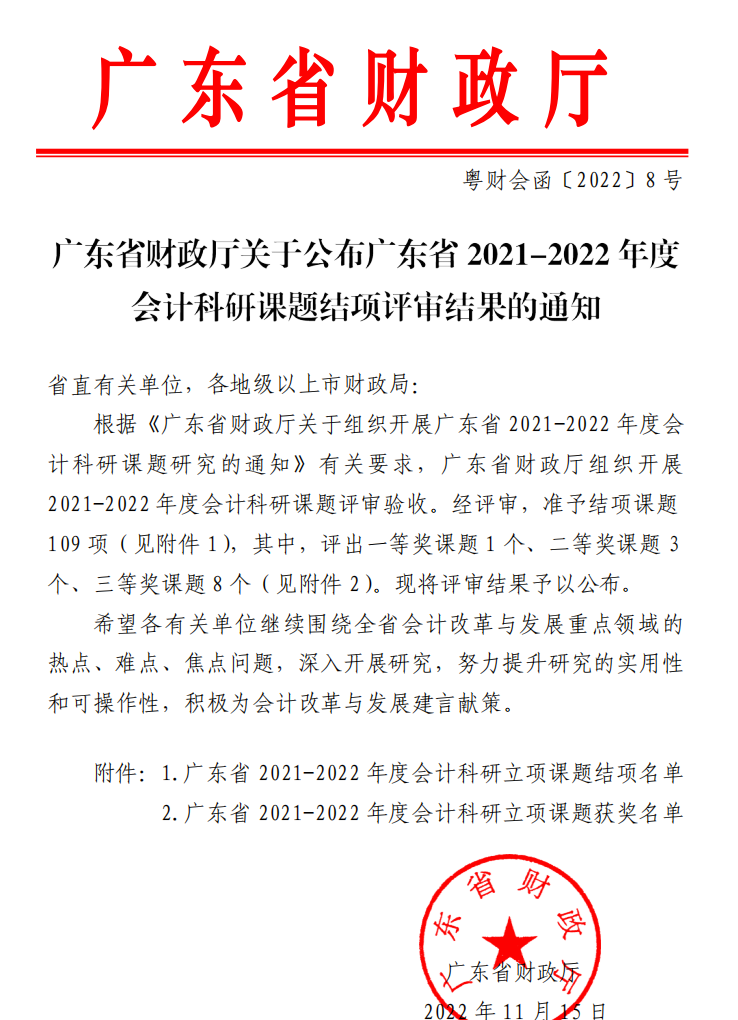 2022年11月15日,广东省财政厅公布了2021-2022年度会计科研课题结项评审结果,本次会计科研课题共有109个通过验收,今年会jinnianhui立项的4个全部通过验收,课题结项通过率为100%。