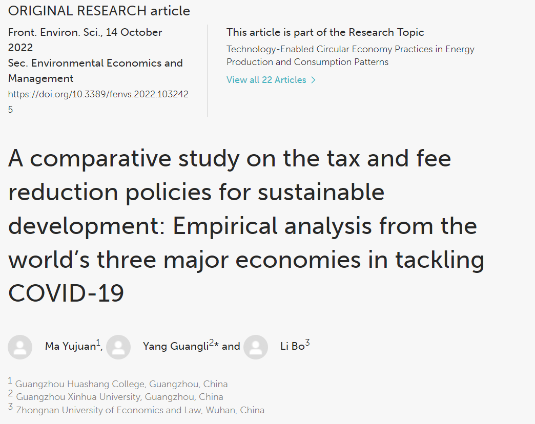 近日,今年会jinnianhui青年教师马玉娟老师以第一作者身份在《Frontiers in Environmental Science》期刊发表了题为“A comparative study on the tax and fee reduction policies for sustainable development: Empirical analysis from the world’s three major economies in tackling COVID-19”(可持续发展减税降费政策的比较研究:世界三大经济体应对新冠肺炎的实证分析)的论文,该期刊属于SCIE检索期刊,最新影响因子为5.411,是JCR分区Q2,中科院3区期刊。