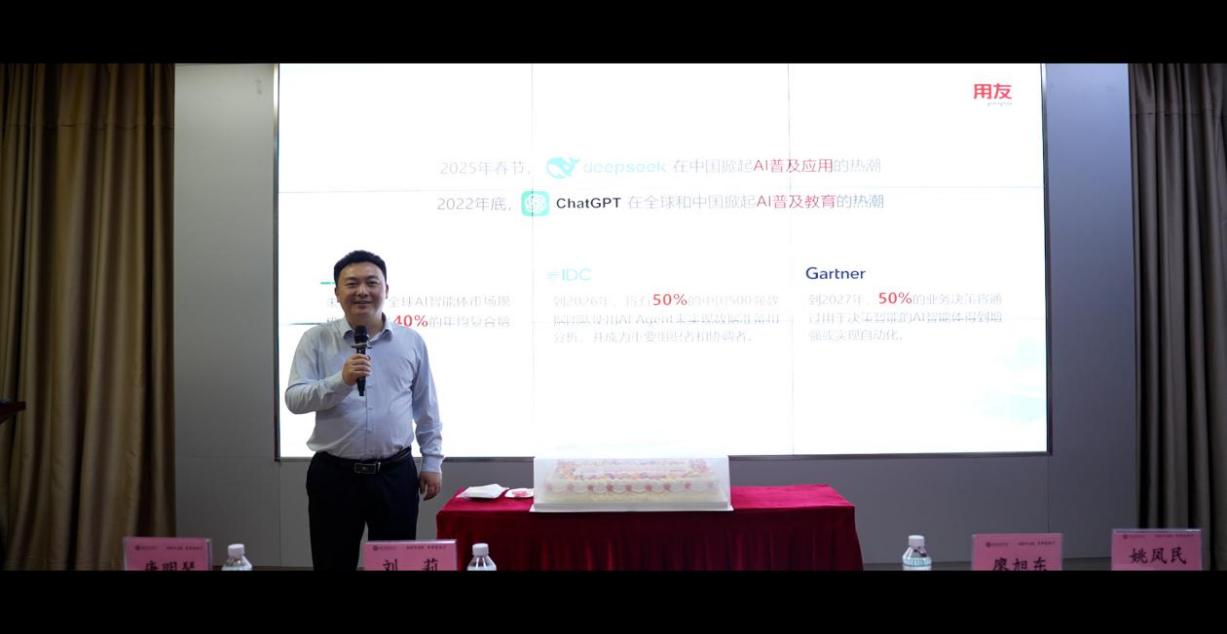 用友集团新道科技股份有限公司助理总裁刘莉女士致辞,她表示,目前产业链、教育链深度合作已成为教育强国的典型培养方法,企业提供产业资源的动态实战,匹配学生职业培养导向,强调产业班融入企业实践课程,这一举措充分体现了学院对培养应用型人才的高度重视。实践出真知,通过丰富的实践课程,学生们将有更多的机会将理论知识与实际操作相结合,提升自己的专业技能和综合素质。