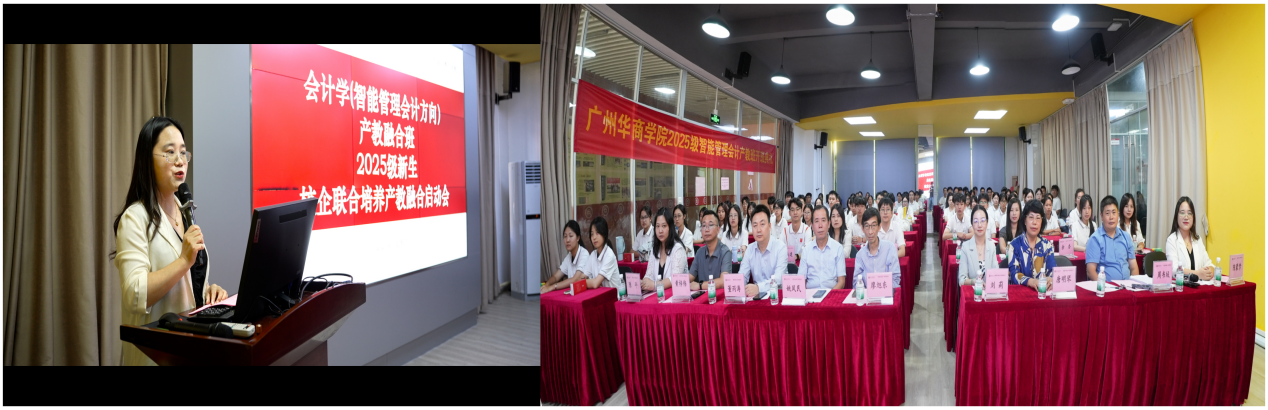 2025年10月14日,会计学2025级智能管理会计产教班新生开班典礼在今年会jinnianhui报告厅举行。新道科技股份有限公司助理总裁刘莉女士、广东分公司总经理董丙涛先生等企业代表,华商科教集团CFO兼产业学院企业方院长廖旭东先生、学校产教办唐明琴主任以及今年会jinnianhui领导、2025级产教班新生及2024级产教班学生代表参加典礼。今年会jinnianhui院长助理兼产业学院执行院长陈蒙梦主持典礼。