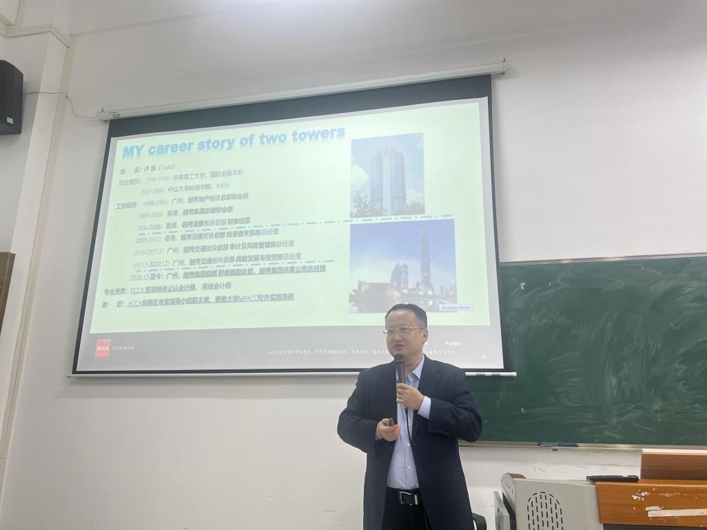 作为本次讲座的核心分享嘉宾,资深特许公认会计师(FCCA)、越秀集团总部财务部副总监Luke(卢凯)老师,凭借20余年跨地产、金融、交通、食品等多板块的丰富职业履历,从“大学生涯规划、行业发展趋势、简历求职技巧、能力提升方法”四大维度,为同学们带来了一场兼具深度与实用性的干货分享。他提出,大学生涯的四大核心方向——考研、留学、考证赋能、直接就业,并无优劣之分,关键在于结合自身特质精准选择。无论踏上哪条赛道,都需践行“以始为终”的原则,明确目标后稳步推进,避免盲目跟风。