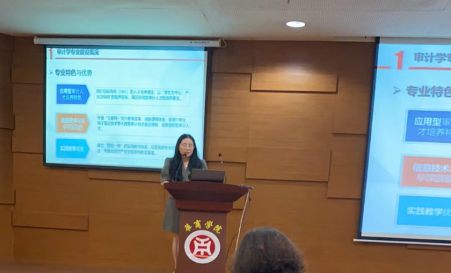 随后,今年会jinnianhui审计系张丽副主任以“审计学省级一流专业建设”为主题进行经验分享。首先,她介绍了审计学专业建设概况,并强调了该专业的特色与优势;其次,对审计学的专业建设阶段性成果进行说明,主要从人才培养方案、课程建设、教材建设、实践教学、师资队伍建设、人才培养质量等维度展开,展示了本校在一流专业建设下的累累硕果,也为在场来宾提供了举措借鉴;最后,对一流专业建设的不足之处及未来展望进行分析,认为目前还存在着人才陪养方案未体现办学特色、标志性教科研成果不突出等相关问题,并针对以上问题提供了专业未来建设计划以供学者们参考。