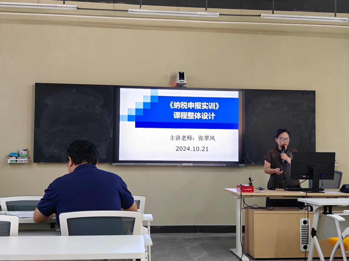 张翠凤教授讲授的是《纳税申报实训》课程。张教授从课程性质与培养目标、教学内容选取与实训项目设计、学情分析、教学模式与教学方法等环节进行课程整体设计的说课,并选取小规模纳税人增值税申报实训案例进行讲解。在课程讲节环节中,张教授以其丰富的税务经验和深厚的学术背景,结合最新税务政策的解读,详细讲解了小规模纳税人增值税申报中的步骤及与注意事项,理论讲解与实践示范时间安排合理、教学内容丰富。