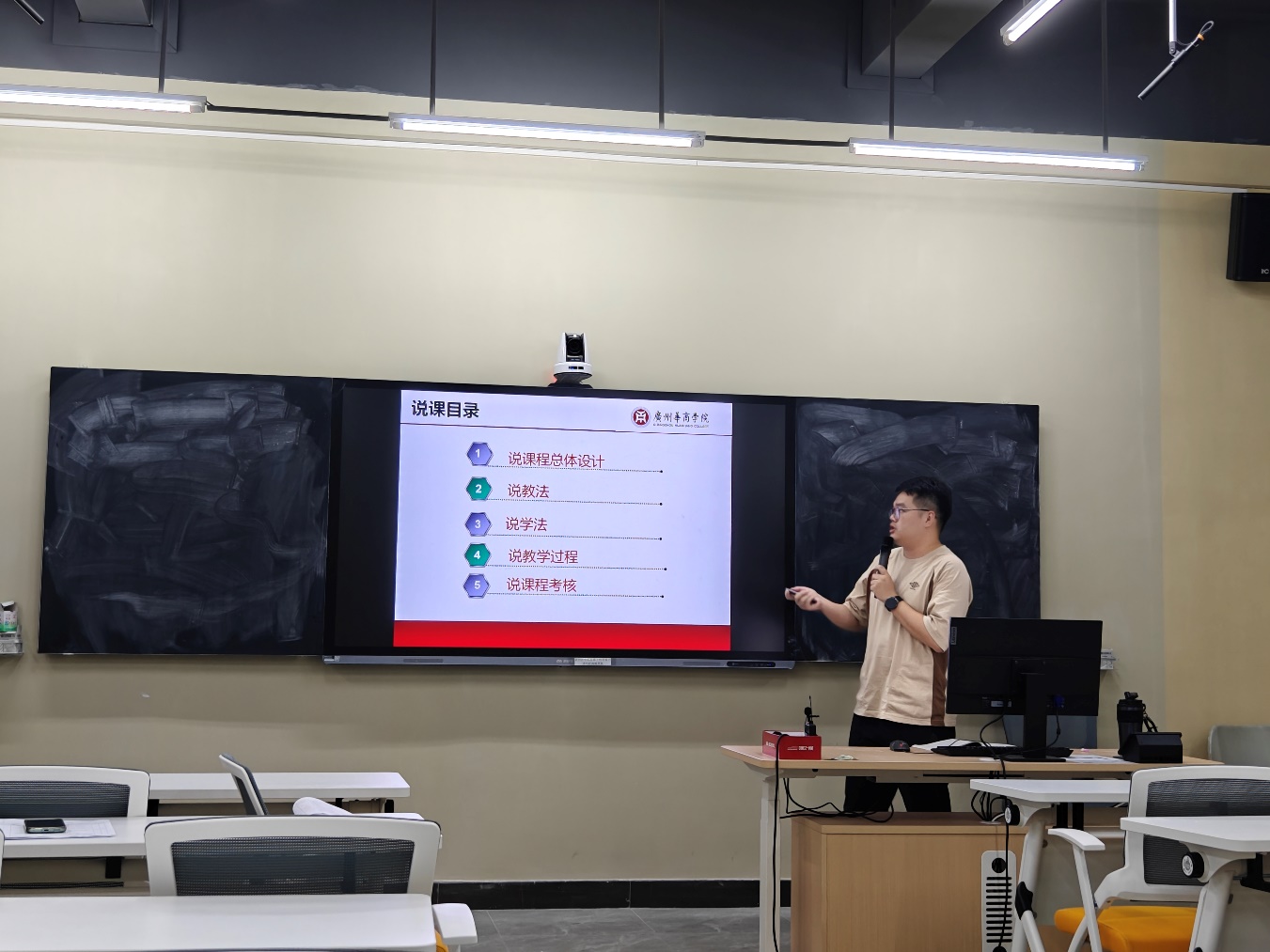 张嘉明老师讲授的是《税收管理》课程。张老师从课程总体设计、教法、学法、教学过程、课程考核五个方面进行说课讲解。张老师选取了课程中税务行政处罚的知识点进行讲解,通过旧知识回顾、新知识讲解、案例视频观看、问题讨论以及习题演练等多个教学环节向参加活动的各位老师展现了一堂丰富生动的课程。