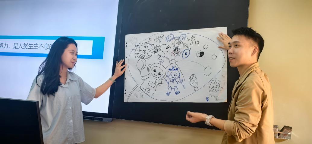 为了让同学们将理论知识更好地应用于实践,张瑞雪老师设计了一项小组创意任务,以 “创造力是人类生生不息的源泉” 为主题进行绘画创作。同学们热情高涨,迅速分成四个小组。在小组讨论环节,大家积极交流、各抒己见,充分发挥想象力和团队合作精神,创作出一幅幅充满创意与思考的成果。