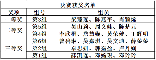 本大赛分为初赛和决赛环节,由马桂芬和马聪慧老师策划。初赛环节由马桂芬、马聪慧、陈雪铃、李睿懿四位老师担任评审,每位评审老师对参赛作品独立打分,最后取平均分,排名前六的队伍进入决赛。考虑到决赛队伍的学生分别来自广州校区和肇庆校区,因此决赛环节采用线上线下相结合的方式来进行,由马桂芬、马聪慧、陈雪铃三位老师担任评委,决赛包括案例汇报和评委提问点评两个环节。