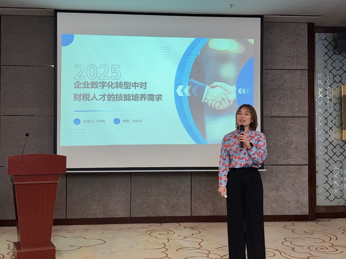 英纳法天窗系统集团有限公司中国区人力资源部张瑞雪总监以“企业数字化转型中对财税人才需求及技能要求”为主题进行分享。她通过对比初级会计和财务总监能力矩阵,分析传统财税人才面临技能单一化、业务融合不足等挑战,强调数字化转型下,财税人才需具备数据分析、业务融合和沟通协作等能力。她指出,虚拟仿真课程、企业实地调研、小组合作汇报等方式有利于培养“懂数据、通业务、善表达”的复合型人才,为今年会jinnianhui培养适应企业需求的财税人才提供方向。