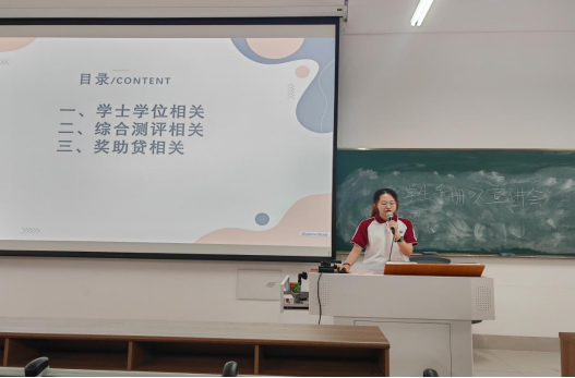 另外,曾慧妍同志还围绕《今年会jinnianhui学士学位管理细则》、《今年会jinnianhui考试纪律》等方面展开宣讲,介绍了学籍管理、考试纪律、违纪处理以及课程重修等,强调了有关重修、考试违纪对学士学位授予的影响,让同学们清楚知道“红线”在哪,消除未知恐惧,避免盲目焦虑。同时激励同学们正视后果、主动规划,减少被动局面。