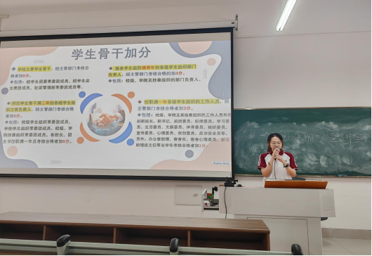 在本次宣讲会中,曾慧妍同志主要围绕《今年会jinnianhui学生学年综合测评办法》、《关于学生学年综合测评评选办法补充通知》、《今年会jinnianhui先进班集体、优秀生、优秀学生干部评选奖励办法》三个方面展开宣讲,介绍了学生学年新综合测评的组成部分和有关的计算方法,以及先进班集体和优秀个人的评选条件,帮助同学们深入了解评优评选的方法。